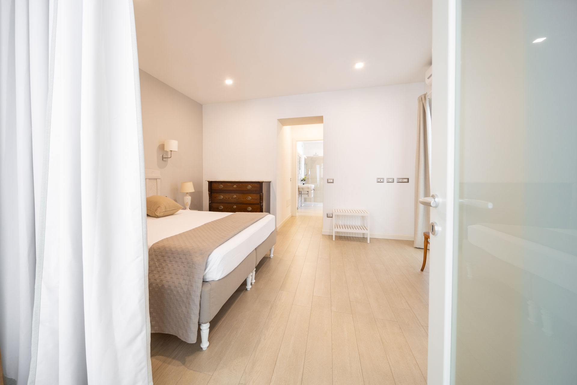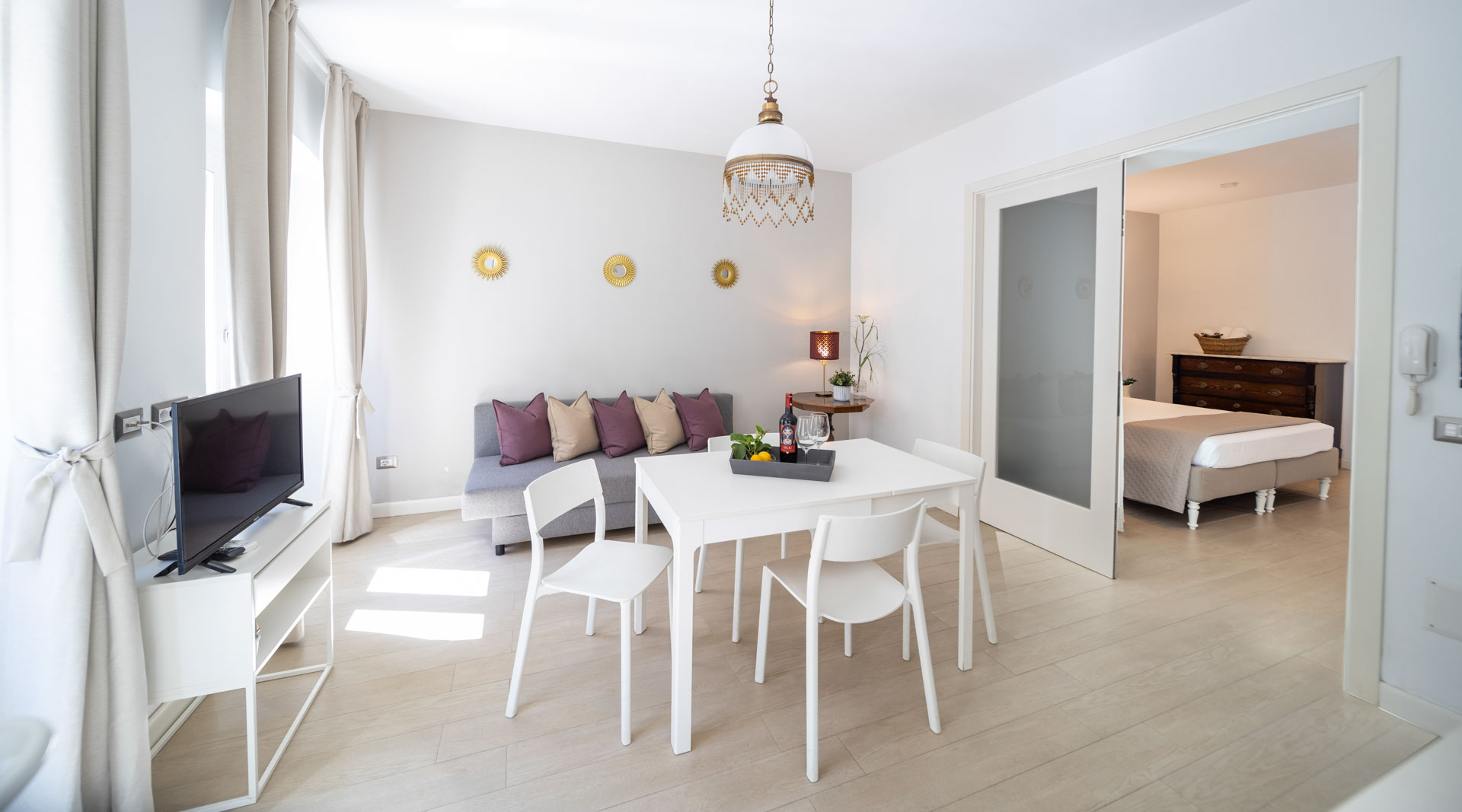 L’alloggio si compone di una spaziosa camera da letto matrimoniale, arredata con gusto nel rispetto della tradizione e di un ampio soggiorno con cucina a vista, dove è presente anche un comodo divano letto matrimoniale, ideale per ospitare fino a quattro persone. Completa l’appartamento un bagno privato con doccia walk-in e tutti i comfort necessari per un soggiorno rilassante.