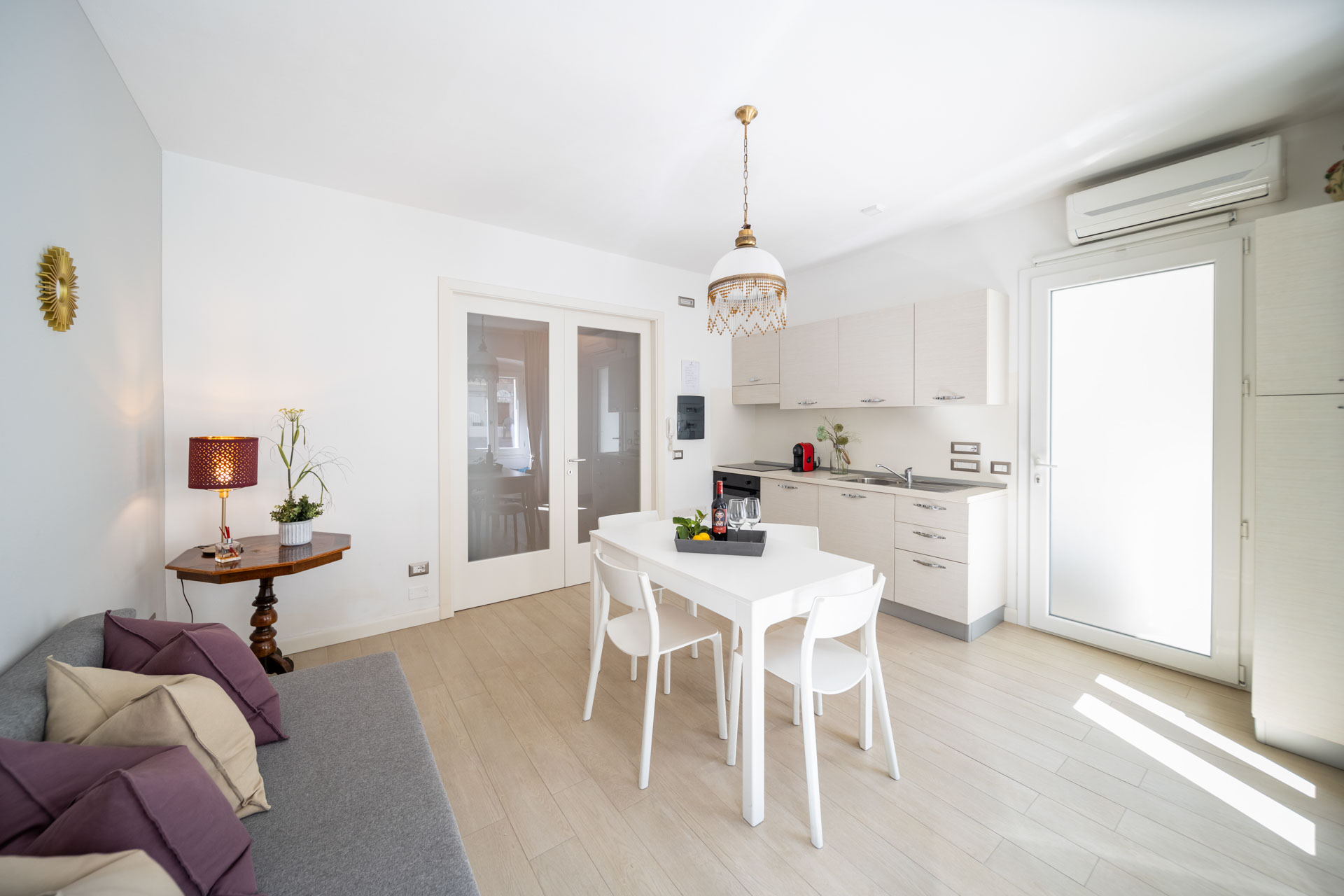 La cucina è completamente attrezzata con elettrodomestici di ultima generazione: lavastoviglie, piano cottura a induzione, forno elettrico, frigorifero con freezer, macchina del caffè a cialde, tostapane e bollitore, tutto pensato per offrire la massima autonomia e praticità anche durante soggiorni più lunghi.